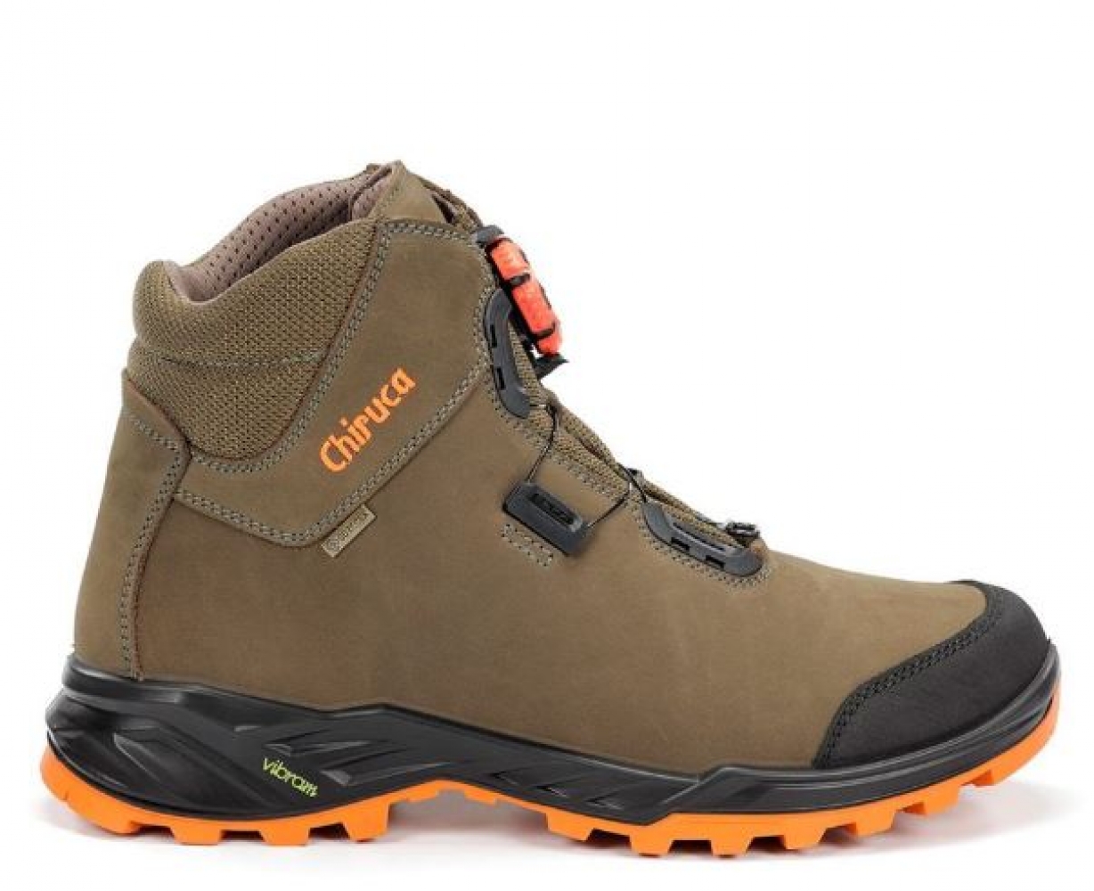Adecuada para todo tipo de terrenos. Bota de piel nobuck, BOA® Fit System, refuerzo en puntera, membrana Gore-Tex impermeable y transpirable con entresuela de poliuretano expandido y patín de caucho Vibram® que proporciona amortiguación y adherencia.
