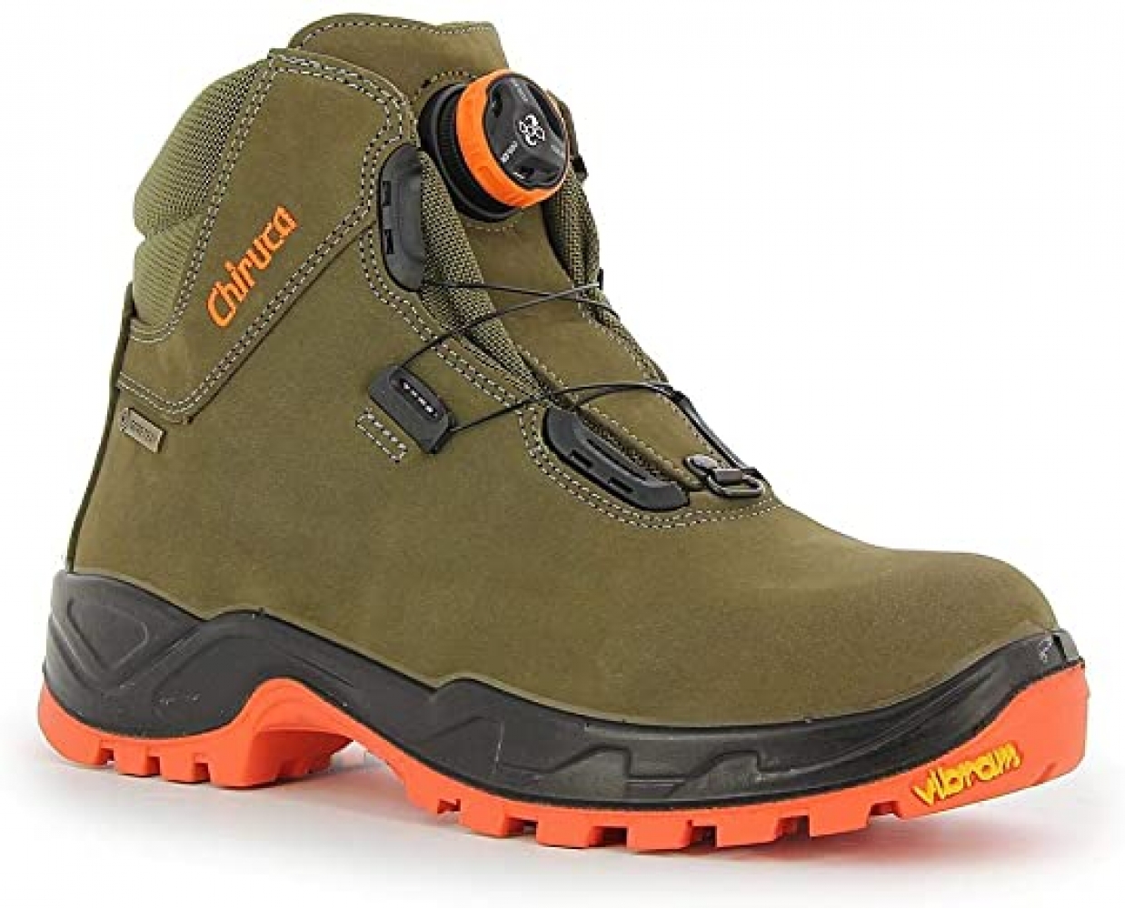 Bota Chiruca fabricada en España en piel nobuck hidrofugada. Cordura hidrorrepelente. Forro Gore-Tex Performance Comfort. Suela de dos densidades: entresuela de poliuretano y patín de caucho Vibram Stone Hi Vis. Peso: 635g.