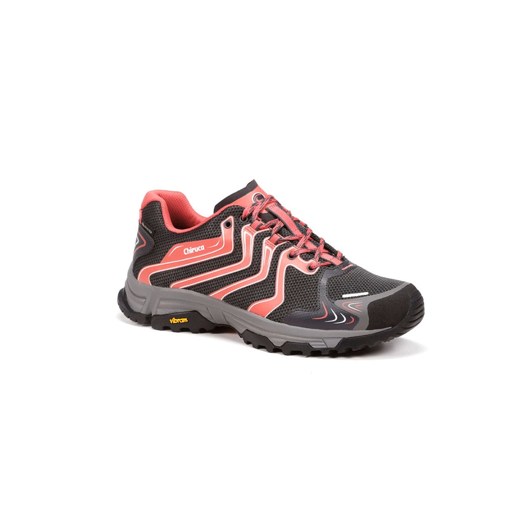 Zapatos de mujer modelo Gomera 09 en color rosa y gris de Chiruca. Este zapato multifuncional está confeccionado en textil y sintético con forro de Gore text . La suela vibran la hacen adecuada para terrenos irregulares por lo que es adecuada para senderismo o para la ciudad.