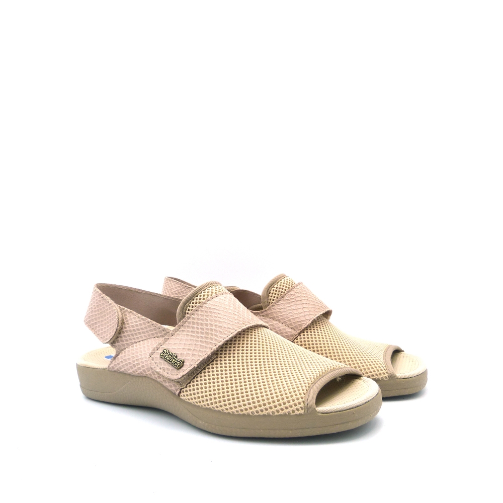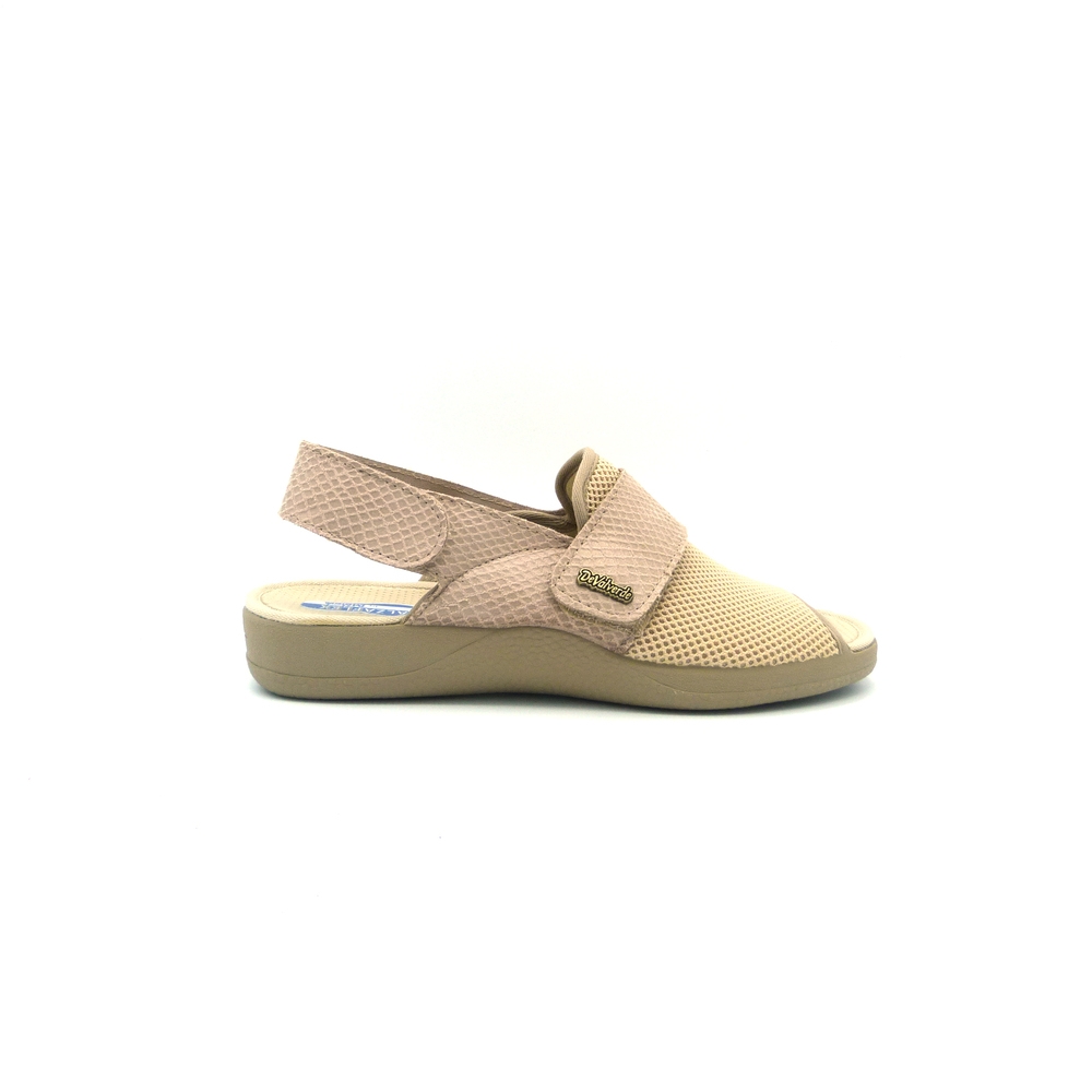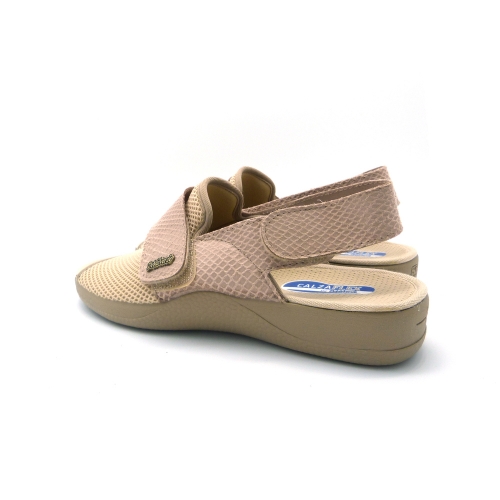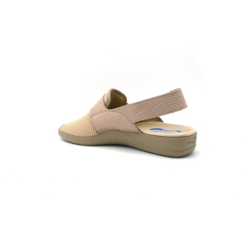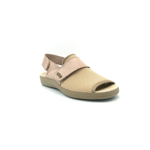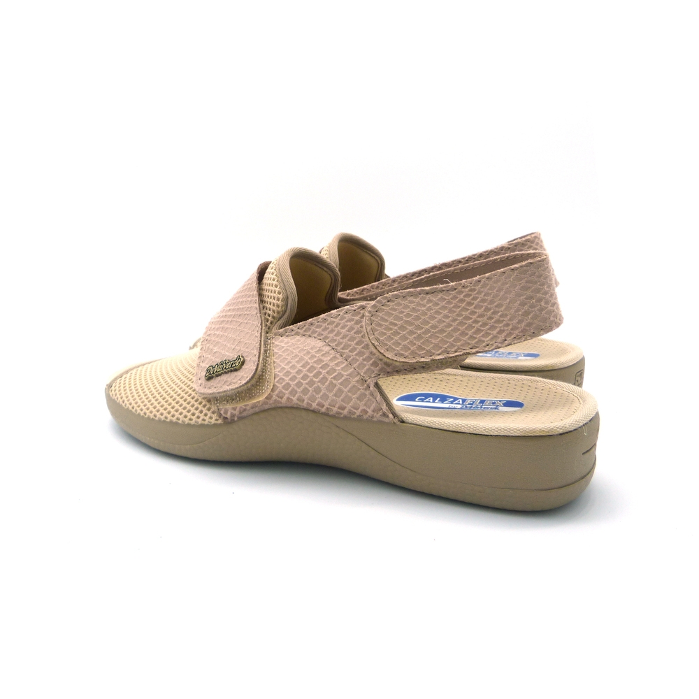 Zapatillas de estar en casa de mujer modelo 1511 en color arena print con dos cierres de velcro. Chinela ideal para el verano por sus tejidos de fibra y algodón que permite la transpiración. Fabricado en España.