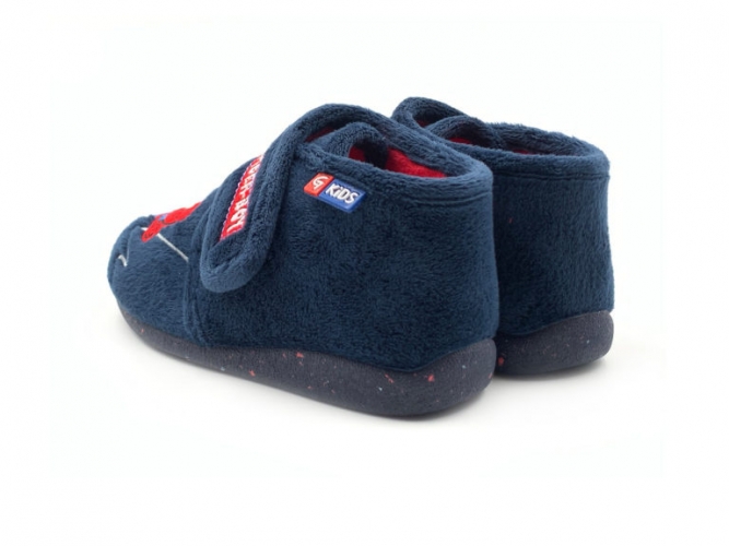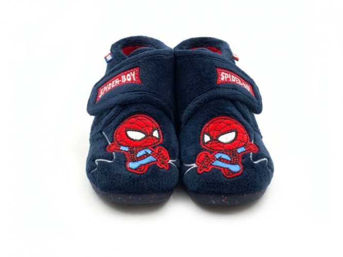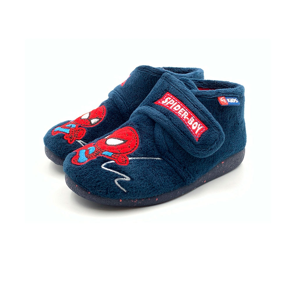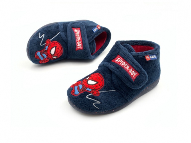 Botitas de casa para bebés modelo 4239 Spiderman color azul marino de Garzón. Fabricado en suave tejido para el invierno y con cierre de velcro. Suela flexible y antideslizante.