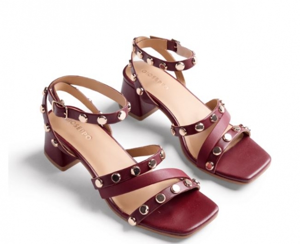 Sandalias d Gioseppo en piel color burdeos con detalle de tachas. Tacón tipo bloque. Plantillas acolchadas y cierre ajustable al tobillo.