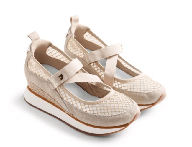 Zapatillas abiertas con piel serraje, rejilla y cuña forrada. Cuentan con planta acolchada y cierres ajustables en el empeine. Atadas con lazos. Altura cuña: 5,5 cm.
