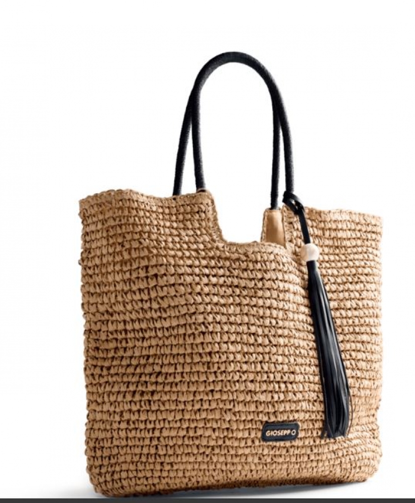 Bolso tipo capazo efecto rafia con detalle de flecos. Forro interior y cierre con cremallera. Asa corta.