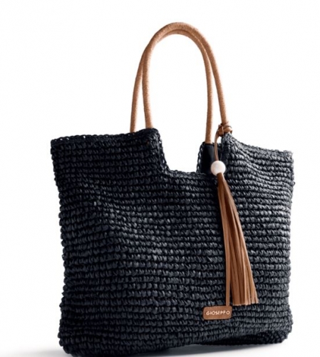 Bolso tipo capazo efecto rafia con detalle de flecos. Forro interior y cierre con cremallera. Asa corta.