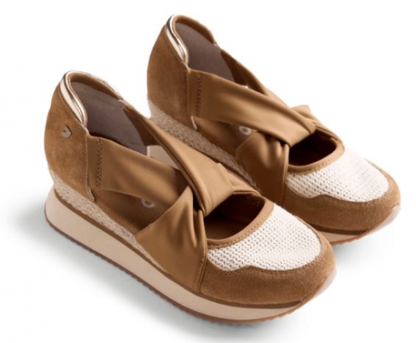 Zapatillas abiertas con piel serraje, crochet hecho a mano y cuña forrada estilo yute. Cuentan con planta acolchada y tiras de sujeción a lo largo del empeine. Altura cuña: 5,5 cm.