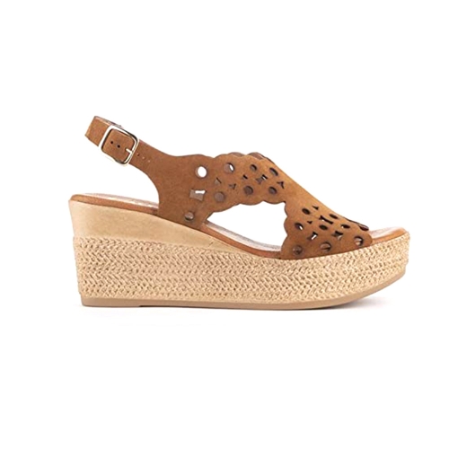 Sandalia color cuero con cuña y detalles de perforaciones en sus tiras. Ideales para esta temporada de primavera/verano.