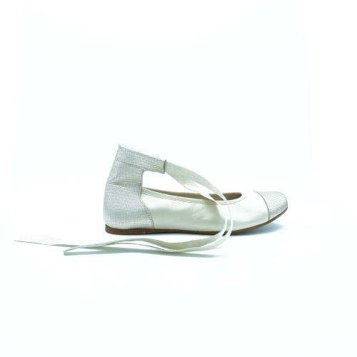 Bailarinas de niña modelo Margot en color Beige de Parisitas. Este modelo de ceremonia es un modelo que es ideal para cualquier ceremonia, en color  beige con puntera y talonera en rejilla oscura. El cierre al tobillo puede realizarse con cinta o cierre de pulsera también incluido.