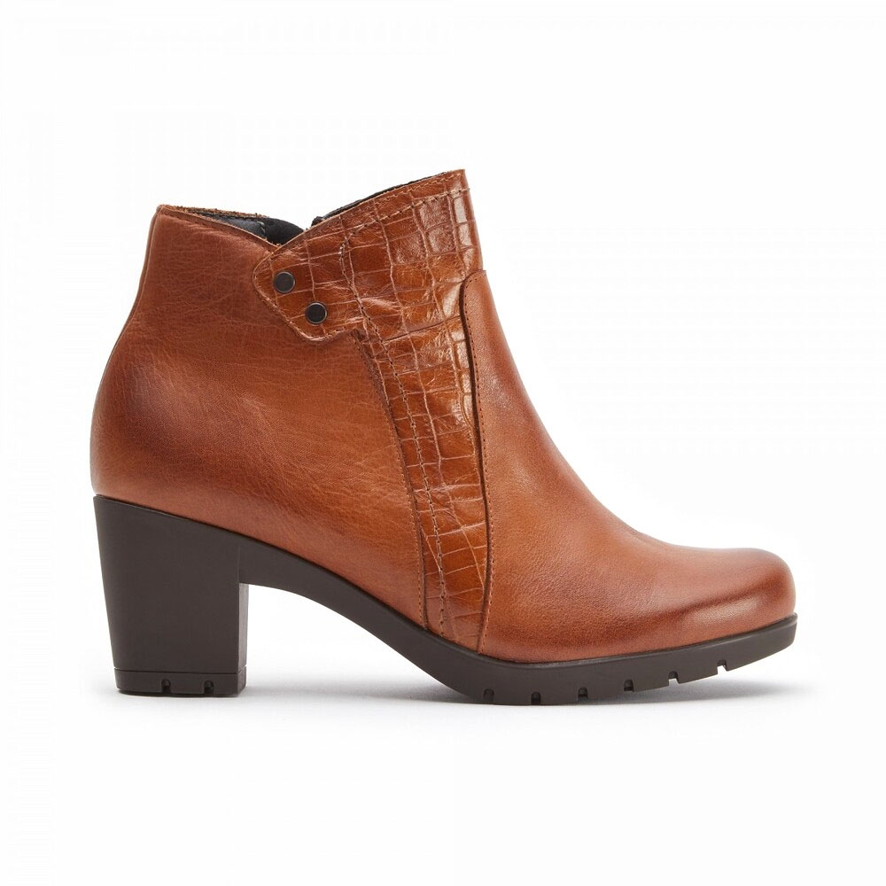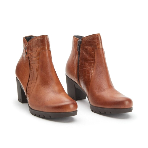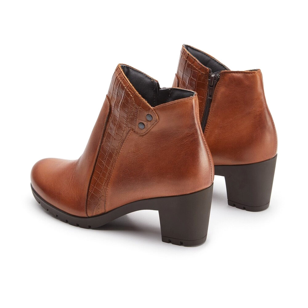 Botín que combina piel lisa y grabada de efecto coco, con detalle de remaches metálicos, líneas sencillas y tacón cómodo. La cremallera interior facilita su uso.