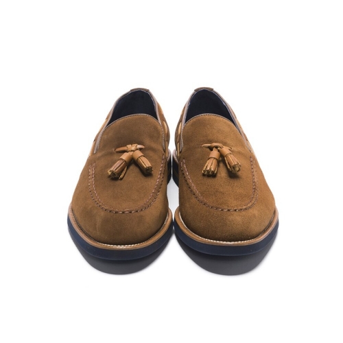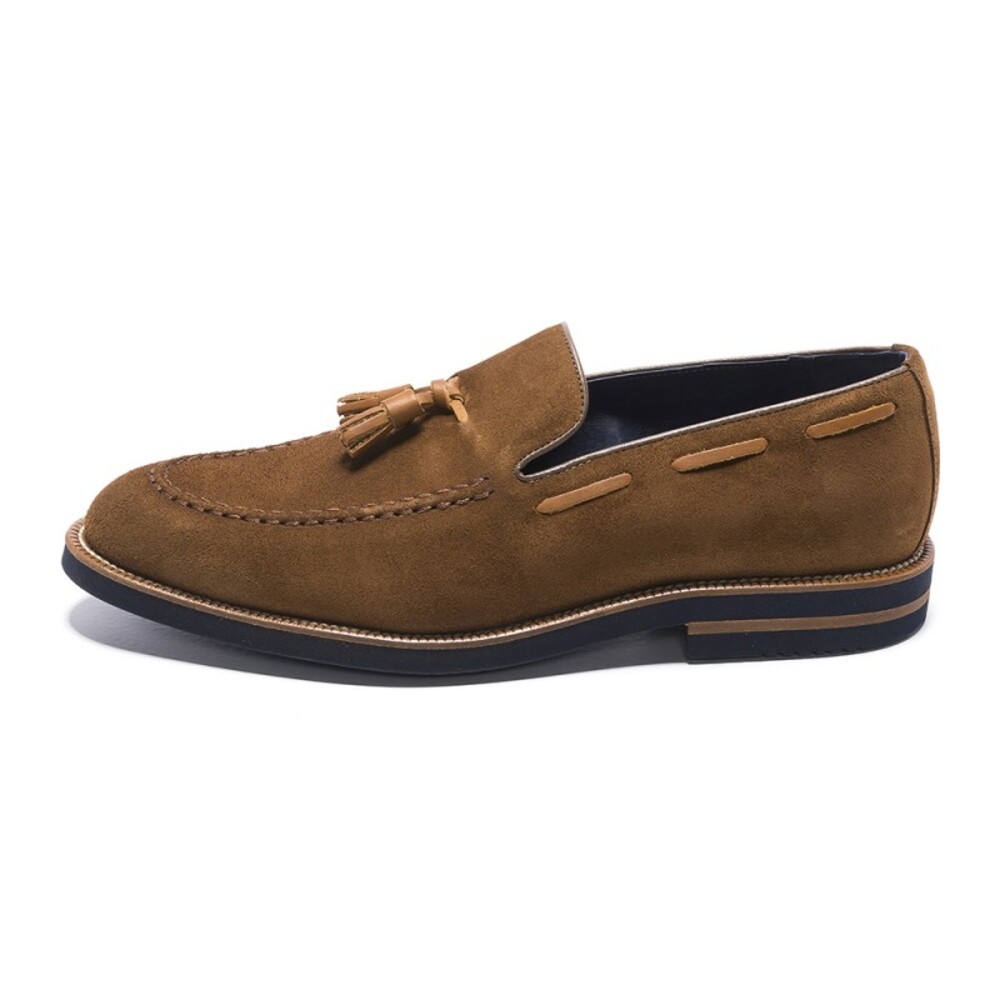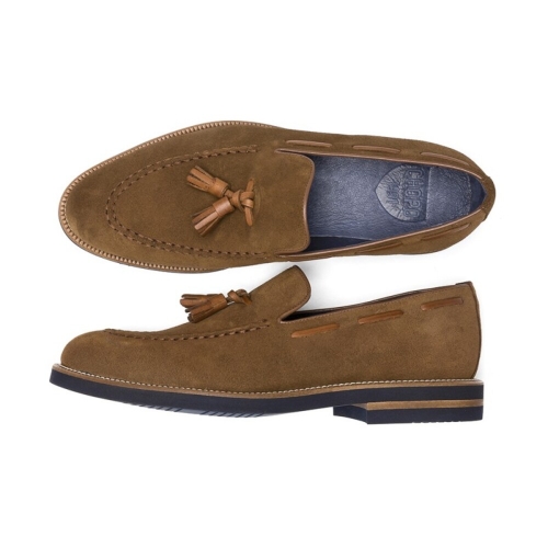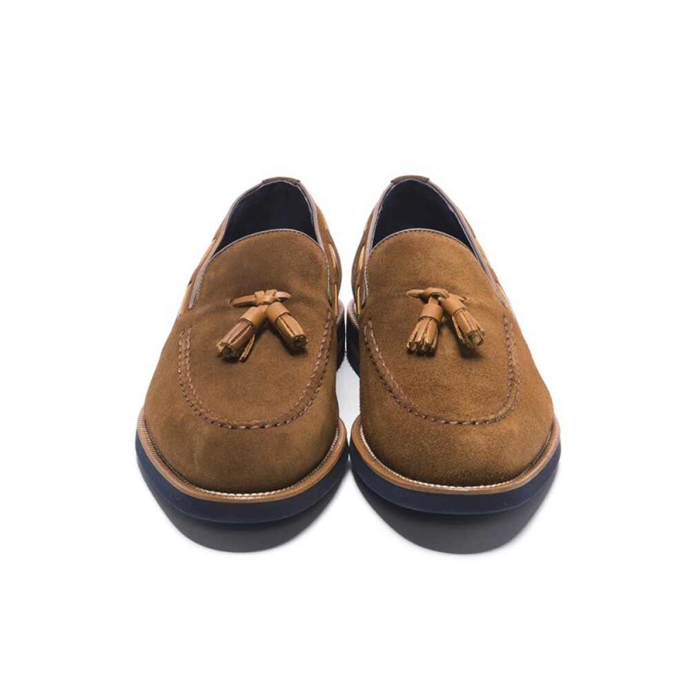 Mocasín hombre diseñado en piel de origen vacuno con puntera redonda y bordón delantero. Costuras vistas, ribetes a color y detalle decorativo de borlas en empeine. Banda náutica lateral, suela exclusiva 'Extremely Light' y tendencia clásica. Diseño y fabricación española.