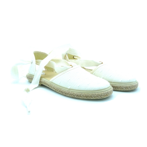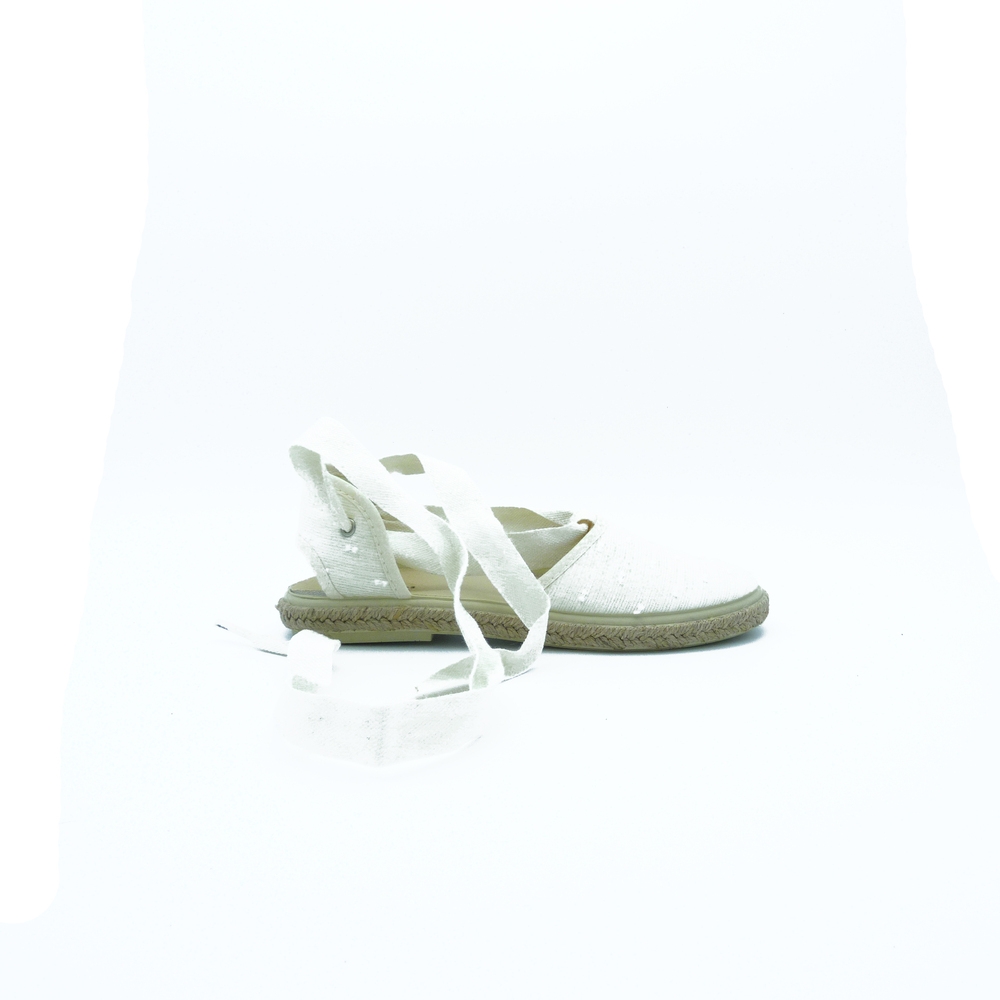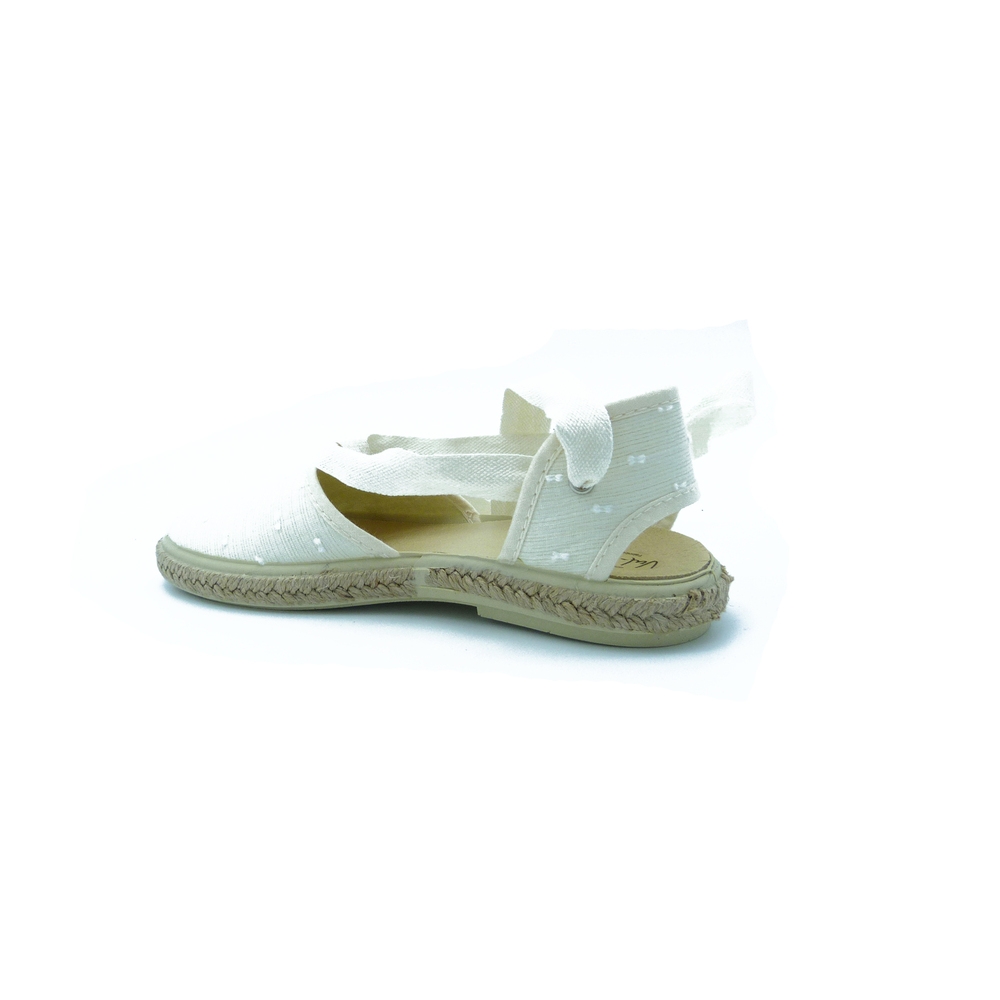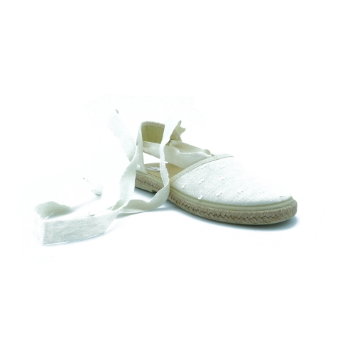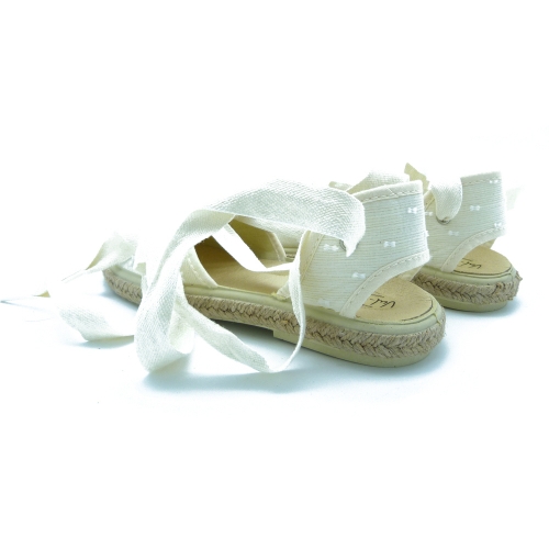 Alpargata de niña modelo 1006-C en color Beig de la marca Vulpeques. Este modelo de alpargata de lona con cinta para atar al tobillo, es el modelo estrella del verano para calzado de ceremonia para niña. La plantilla es acolchada para dar mayor comodidad en la pisada, con suela de goma flexible y una tira de esparto que le da ese look tan de moda en el calzado de verano.